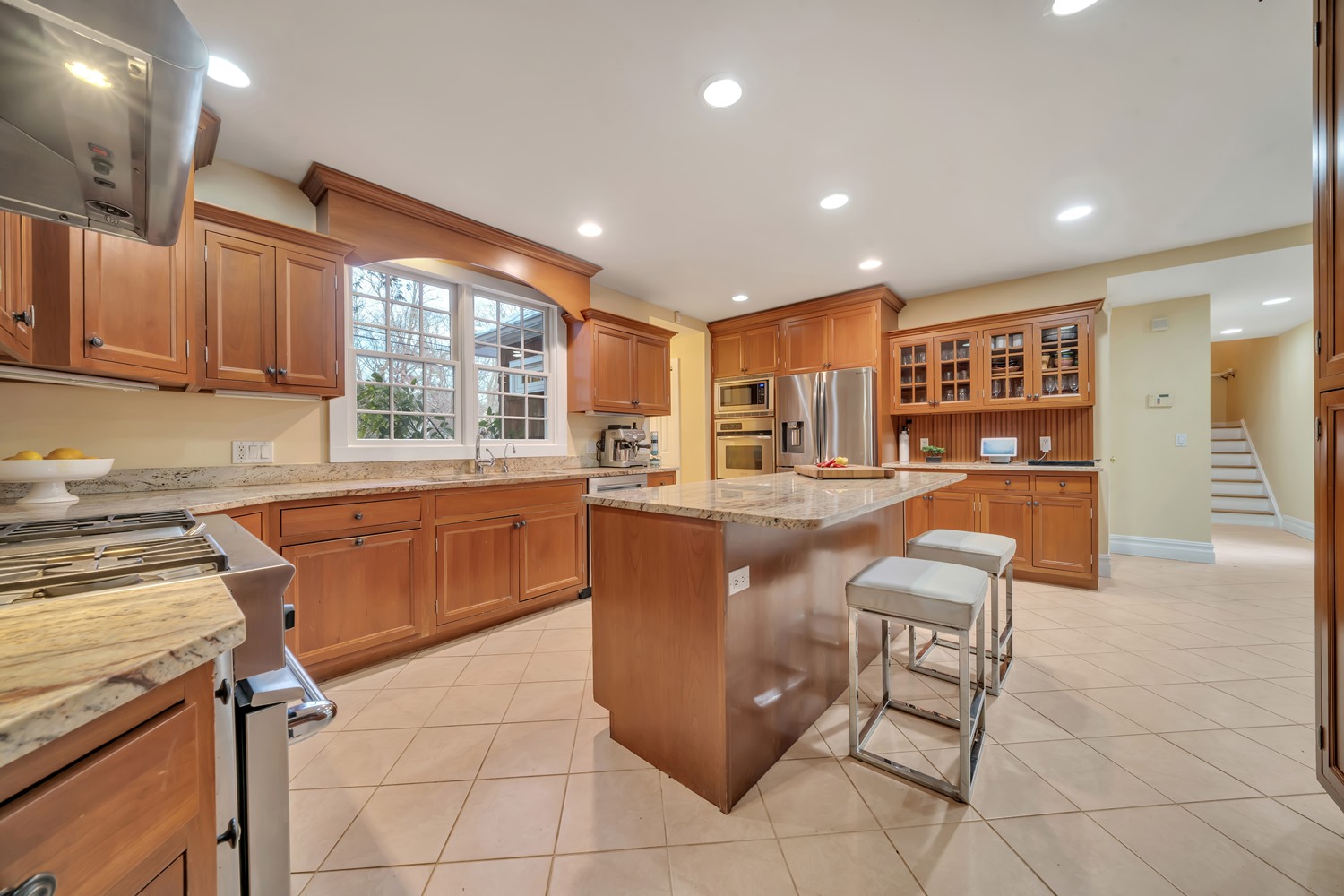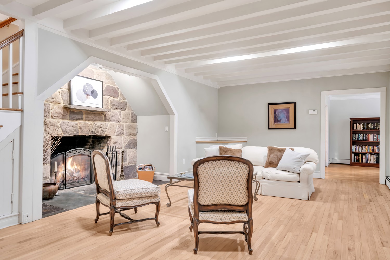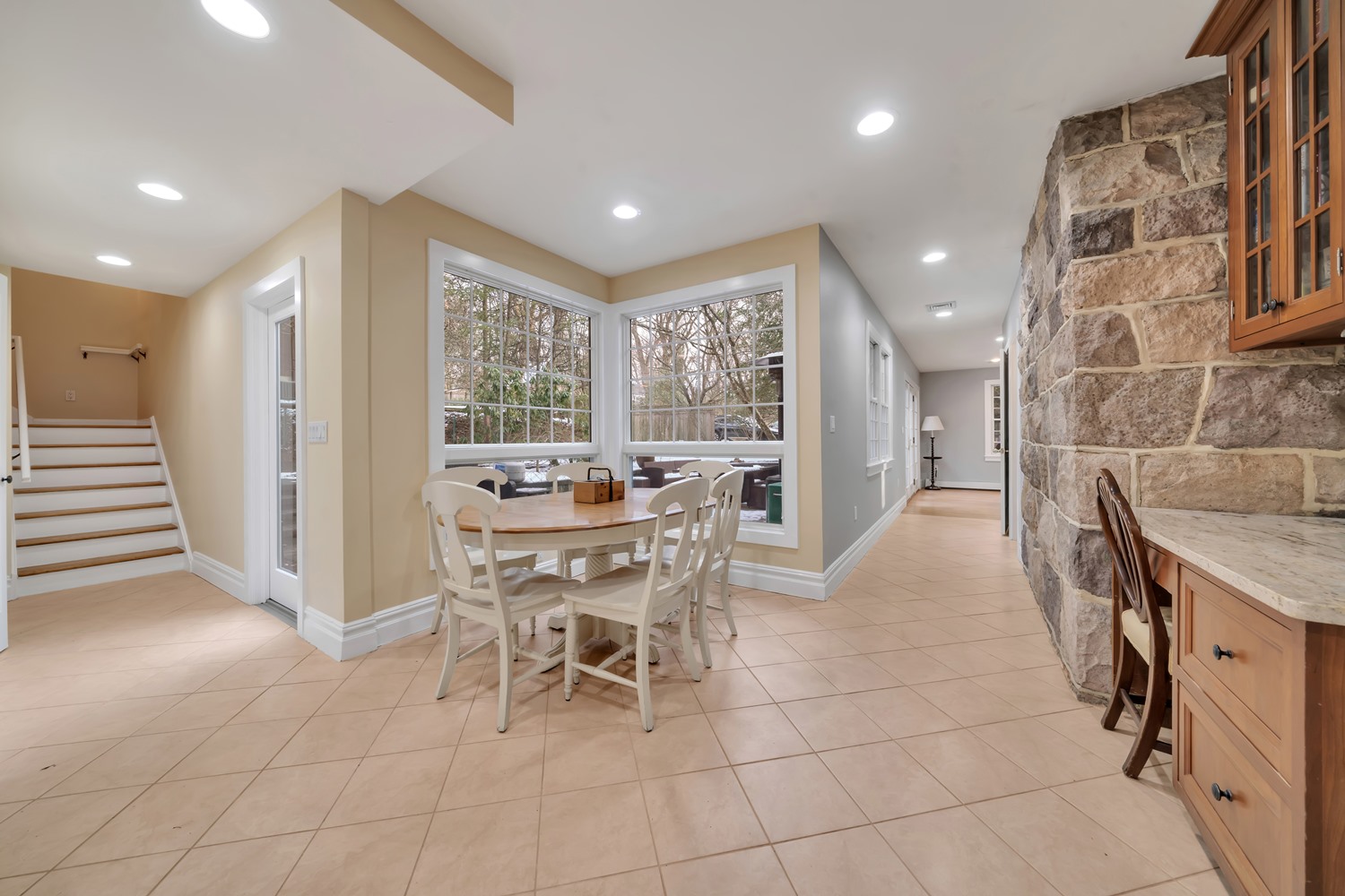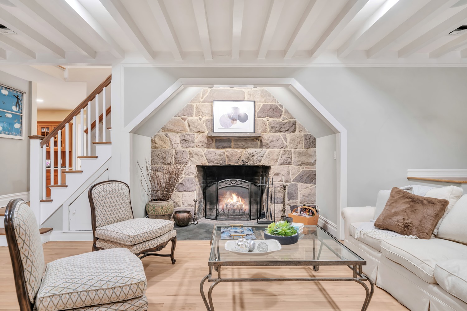 A gracious entry foyer flows into the spacious living room, with newly refinished wood floors, detailed millwork, and a dramatic stone inglenook fireplace serves as a stunning focal point. The Formal dining room offers timeless elegance with a sunlit bay window, refinished wood floors, classic crown molding, and generous oversized doorways The heart of the home is the expansive kitchen and breakfast area, with radiant heated floors, custom cabinetry, center island seating, and oversized windows overlooking the backyard and patio. The backyard features a beautifully crafted retaining wall framing a spacious paver patio, perfect for entertaining and outdoor living.
