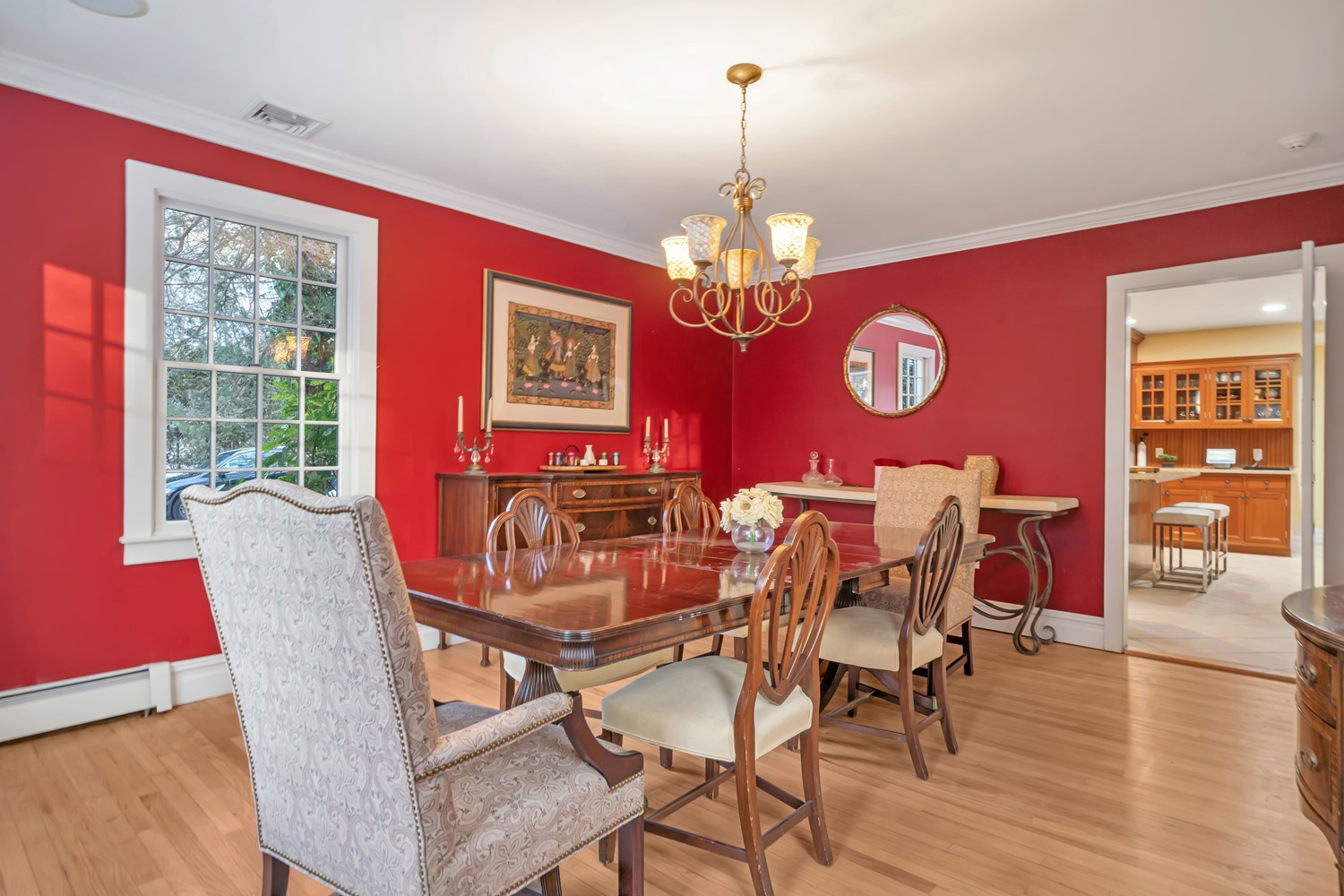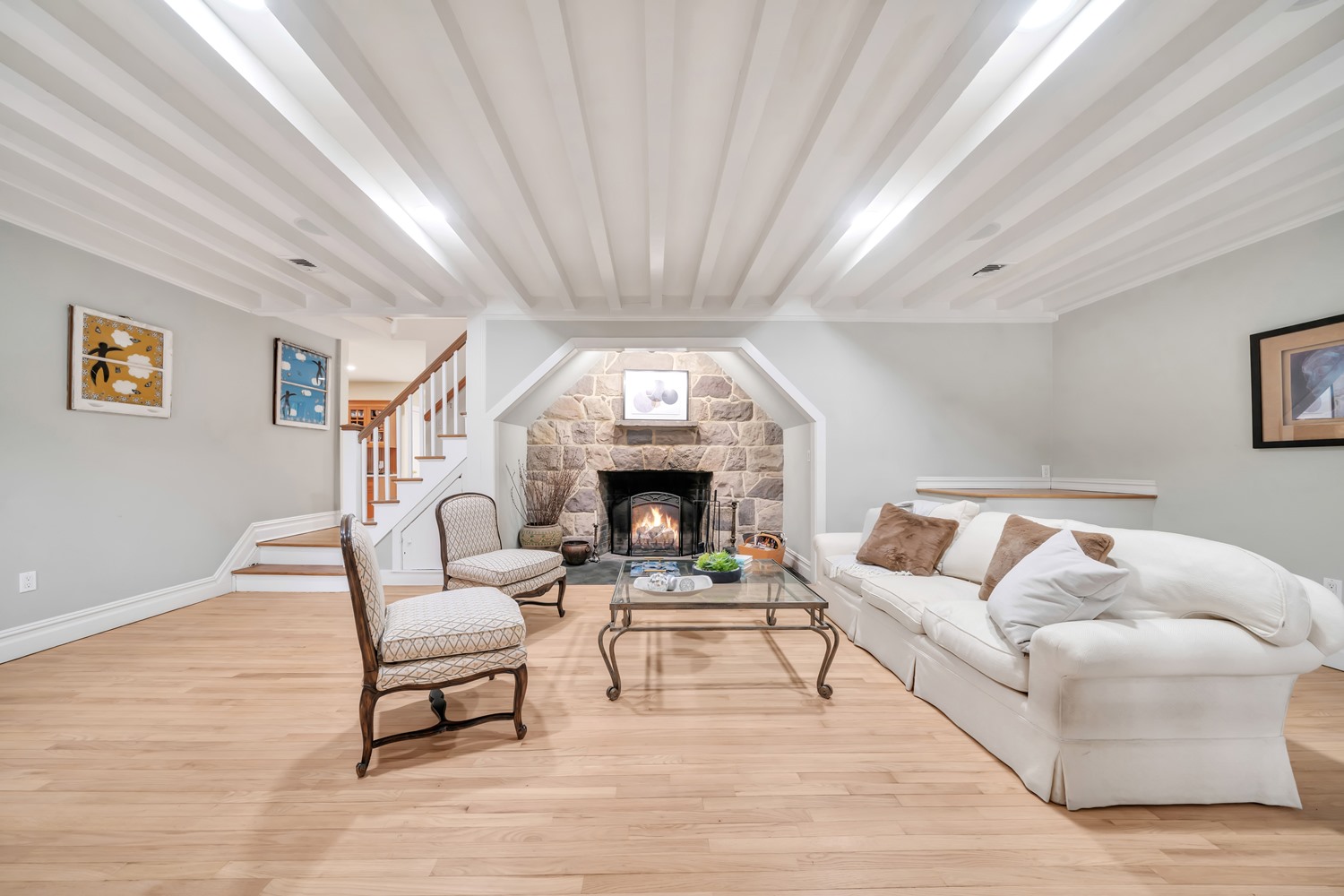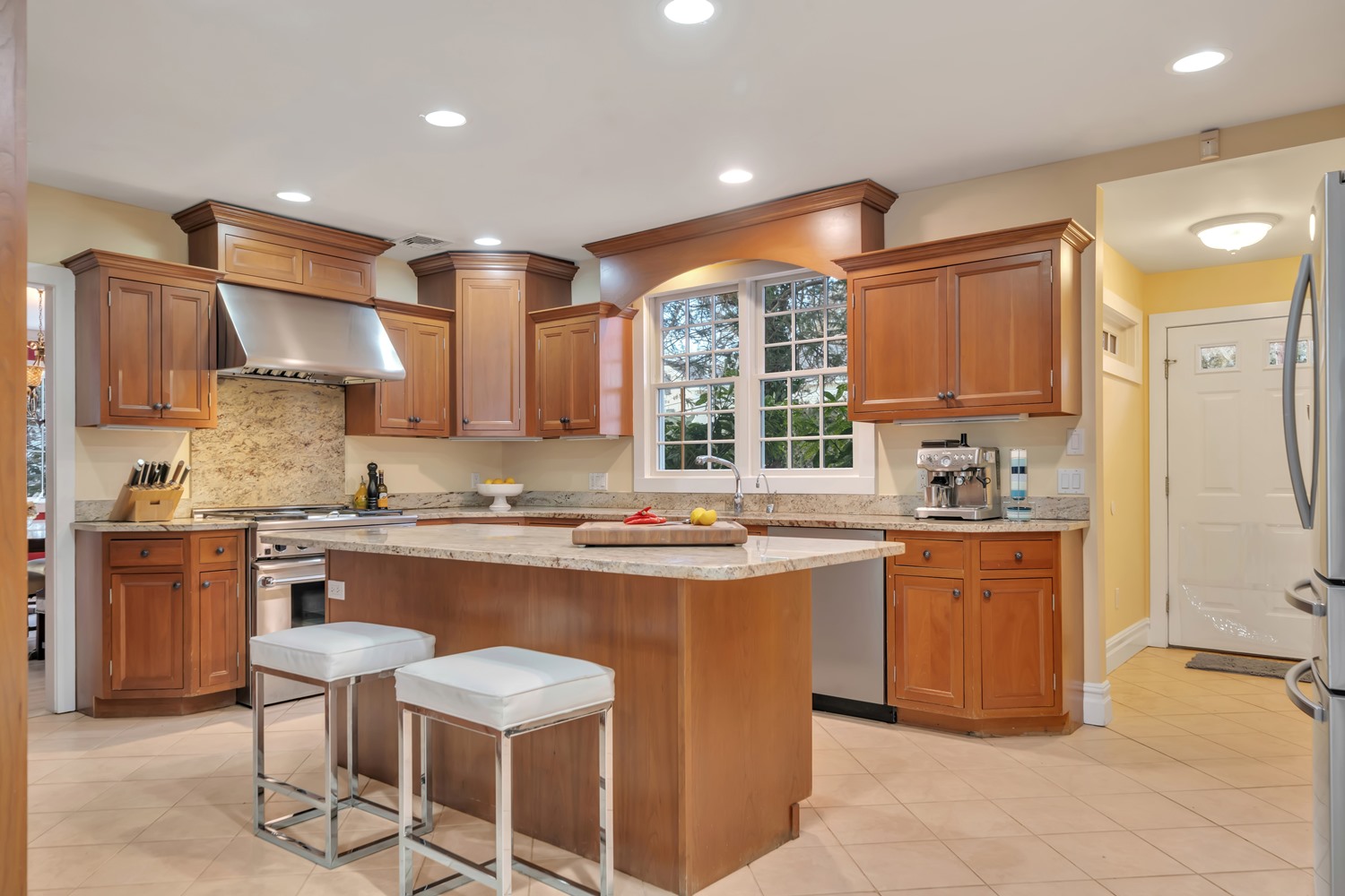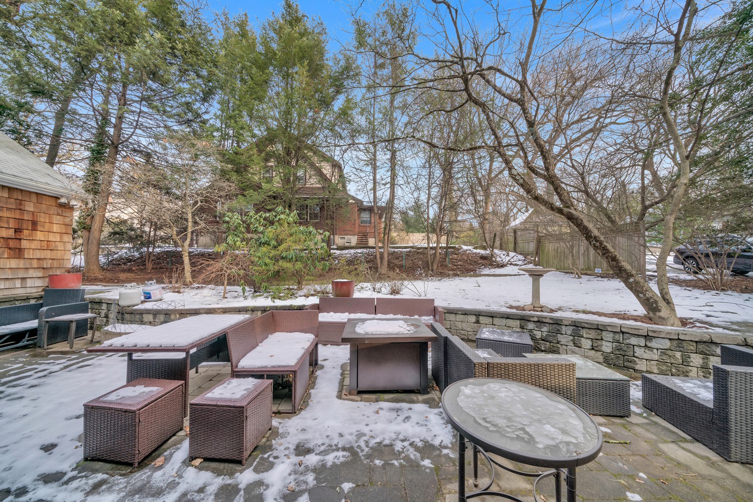 A gracious entry foyer flows into the spacious living room, with newly refinished wood floors, detailed millwork, and a dramatic stone inglenook fireplace serves as a stunning focal point. The Formal dining room offers timeless elegance with a sunlit bay window, refinished wood floors, classic crown molding, and generous oversized doorways The heart of the home is the expansive kitchen and breakfast area, with radiant heated floors, custom cabinetry, center island seating, and oversized windows overlooking the backyard and patio. The backyard features a beautifully crafted retaining wall framing a spacious paver patio, perfect for entertaining and outdoor living.