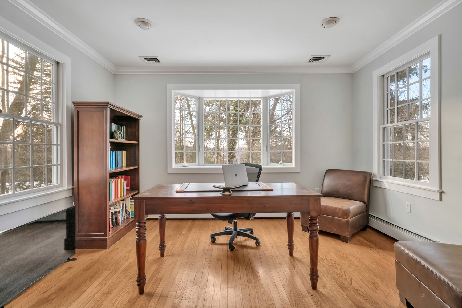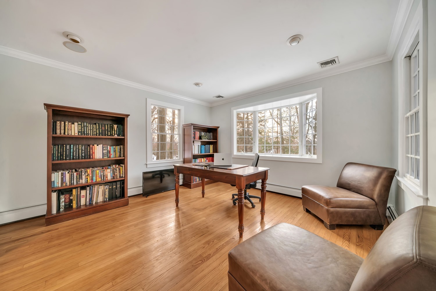Beautifully layered living spaces continue with a family room featuring expansive glass-paned French doors to the backyard, alongside a private office with a bay window and oversized doorways, offering versatility for modern living. Upstairs, the primary suite features multiple exposures, a walk-in closet, and a spa-like bath with jacuzzi tub and glass-enclosed steam shower. Four additional bedrooms are bright, airy, and thoughtfully designed for comfort, each filled with natural light and ample closet space, complimented by two full bathrooms that combine style and functionality for family and guests.